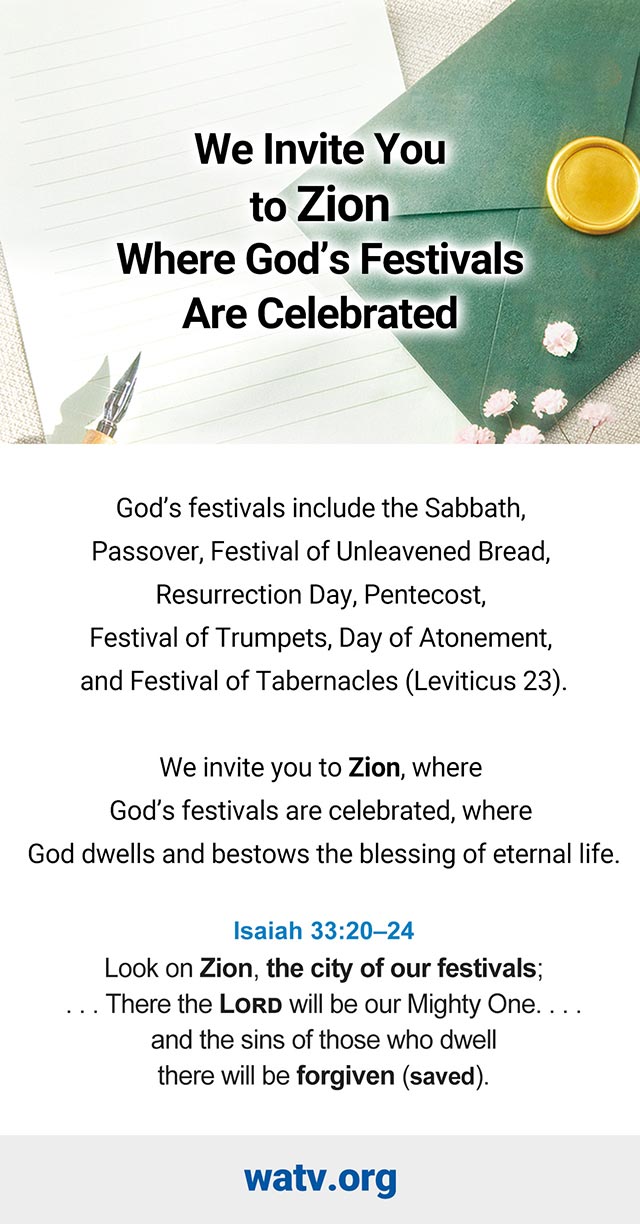 Card News We Invite You to Zion Where God’s Festivals Are Celebrated 21,191 views 카카오톡 공유하기 Press the image long enough and save it. Right click the mouse on the image and save it. 카카오톡 공유하기 Back Related posts Starlight: The Universe’s Signal In the movie Interstellar, the protagonist embarks on a space mission for the future of… Ransom As he expected, Jesus Himself came down to the earth in the flesh to save… Destiny “The events that will necessarily happen to a particular person or thing in the future,…