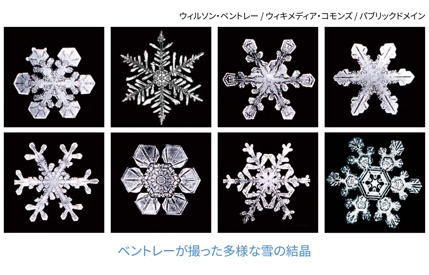 こうして作られた雪片の美しさに酔って一生を送った人もいる。米バーモント州のある農家で生まれたベントレーは、15歳の時、母親から顕微鏡をプレゼントされ、偶然、雪の結晶を見るようになった。それによってベントレーの人生は180度変わった。彼は当時は高価だったカメラを購入し、雪の結晶の撮影に挑戦した。地上に降りてきた雪の結晶は数秒から数分の間にその形を失い、観察が非常に難しい。彼は多くの試行錯誤の末、二年ぶりに白黒で雪の結晶の撮影に成功した。彼が撮った写真は、雪の結晶の優雅な構造と完璧な対称性、一つも同じ形がないという多様性を世の中に教えてくれた。肺炎で66歳で亡くなる直前まで雪の結晶の写真を撮った彼は「数多くの写真を撮ったが、全く同じ雪の結晶は一つもなかった」と回顧した。