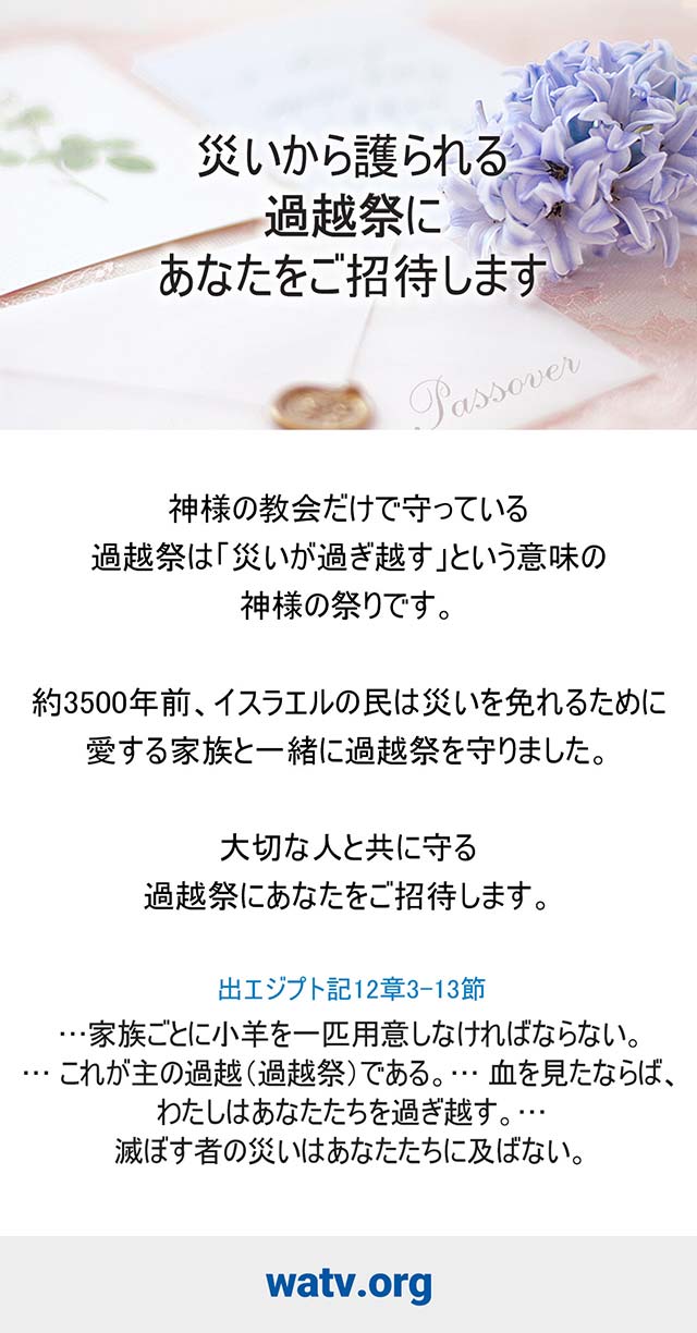 カード ニュース 災いから護られる過越祭にあなたをご招待します 13,733 回視聴 카카오톡 공유하기 画像を長押しして保存します。 マウスの右ボタンをクリックして画像を保存します。 카카오톡 공유하기 戻る 関連文 献げ物が有り余るほどだ 神様から二回目の十戒を受けて、… 受けた力で 「高く飛ぶ鳥が遠くを見る」とい… 母から授かった生命の遺産、ミトコンドリア 私たちの生命に不可欠な要素であ…