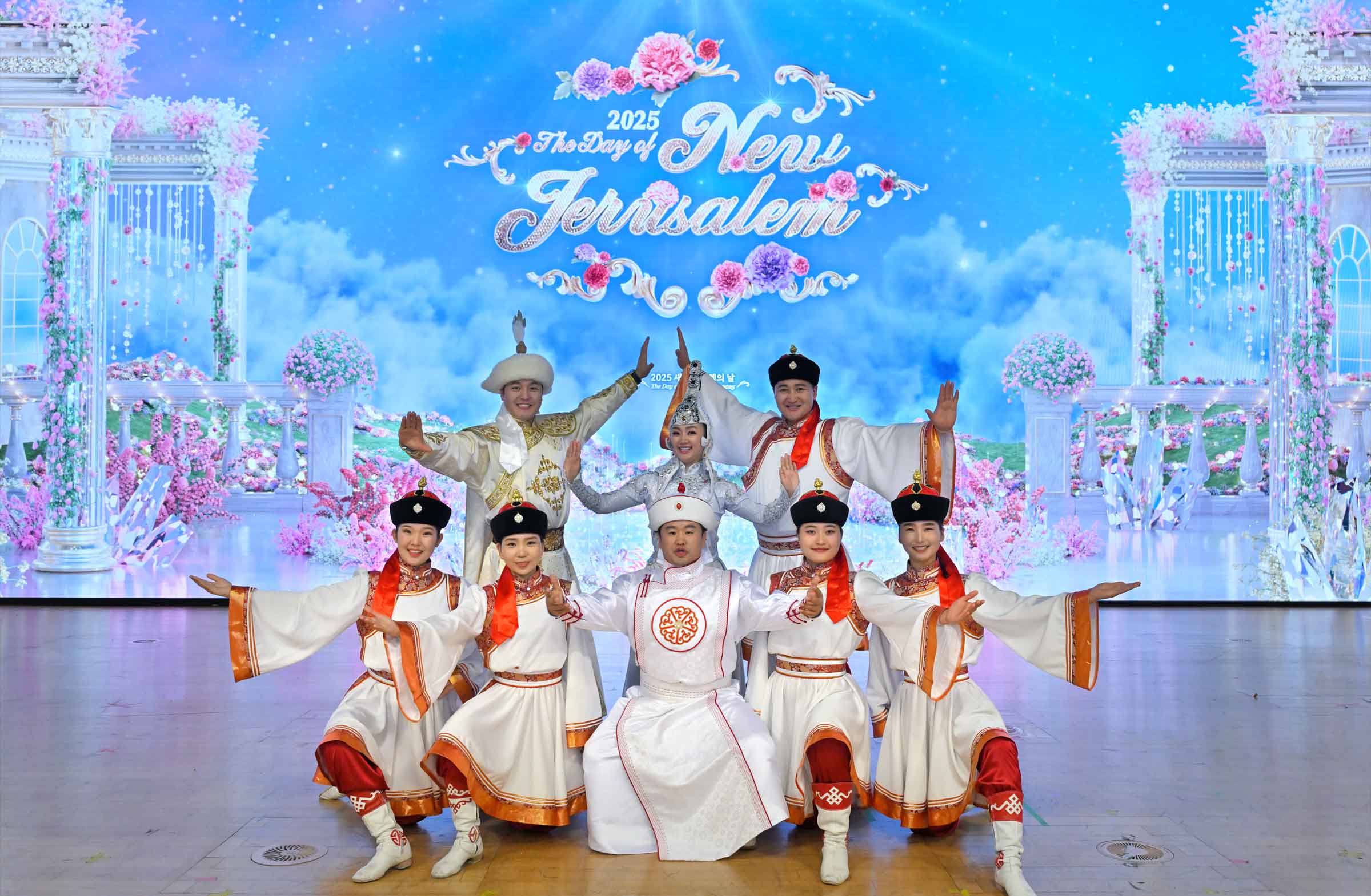 이날 기념행사에서는 제83차 해외성도 방문단이 새 예루살렘의 날을 축하하는 사절단으로 나서서 풍성한 공연을 선보였다. 어머니를 향한 감사와 구원의 기쁨을 아름다운 화음으로 노래한 한국·남아프리카공화국·미국 연합중창단에 이어 몽골의 마두금(몽골 전통악기) 연주자와 한국의 메시아 오케스트라가 협연을 펼쳤다. 어머니의 너른 품과 같은 몽골의 대자연을 연상시키는 웅장한 선율에 박수갈채가 쏟아졌다. 브라질, 말레이시아, 미국 등 세계 전역에서 온 성도들도 차례로 무대에 올라 각국의 전통과 특징을 살린 퍼포먼스를 선보였다. 경쾌한 발놀림이 돋보이는 캐나다 민속춤 ‘메티스 지깅’, 흥겨운 팬파이프 연주에 맞춘 페루 안데스 지역 민속춤 ‘발리차’ 등 이채로운 무대가 어우러져 어머니 사랑으로 하나 된 지구촌을 연상시켰다. 방문단은 열정 어린 공연을 통해, 어머니를 구심점으로 연합하며 사랑으로 세계복음을 이루겠다는 당찬 의지를 전했다. 창조주 엘로힘 하나님의 권능으로 이루어지는 구원의 역사를 다룬 기획영상도 진한 감동을 안겼다.