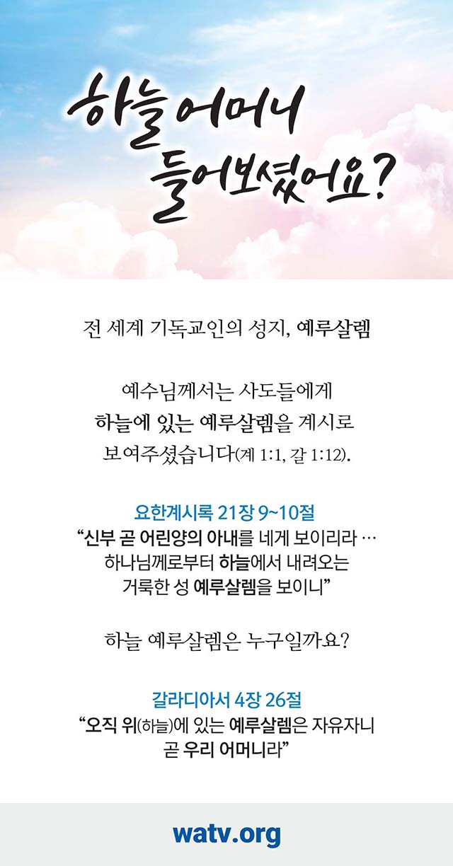 카드 뉴스 하늘 어머니 들어보셨어요? 조회 10,234 카카오톡 공유하기 이미지를 길게 눌러 저장합니다. 마우스 오른쪽 버튼을 클릭하여 이미지를 저장합니다. 카카오톡 공유하기 뒤로가기 관련 글 만나와 안식일 옛적 이스라엘 백성들이 애굽에서 해방되어 약속의 땅 가나안으로 향할 때, 드넓은 광야를 통과해야 했습니다. 그… 무에서 유를 창조하신 하나님 천지 창조의 역사를 보면 무(無)의 세계였던 지구가 하나님의 손길로 하나하나 채워지기 시작했습니다. 낮과 밤이 구분되고,… 예물이 쓰기에 남음이 있었더라 하나님께 두 번째 십계명을 받아 시내산에서 내려온 모세가 이스라엘 백성들 앞에서 십계명을 보관할 성막을 짓는…