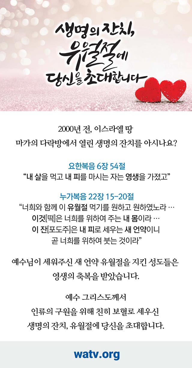 카드 뉴스 생명의 잔치, 유월절에 당신을 초대합니다 조회 4,149 카카오톡 공유하기 이미지를 길게 눌러 저장합니다. 마우스 오른쪽 버튼을 클릭하여 이미지를 저장합니다. 카카오톡 공유하기 뒤로가기 관련 글 만나와 안식일 옛적 이스라엘 백성들이 애굽에서 해방되어 약속의 땅 가나안으로 향할 때, 드넓은 광야를 통과해야 했습니다. 그… 무에서 유를 창조하신 하나님 천지 창조의 역사를 보면 무(無)의 세계였던 지구가 하나님의 손길로 하나하나 채워지기 시작했습니다. 낮과 밤이 구분되고,… 예물이 쓰기에 남음이 있었더라 하나님께 두 번째 십계명을 받아 시내산에서 내려온 모세가 이스라엘 백성들 앞에서 십계명을 보관할 성막을 짓는…