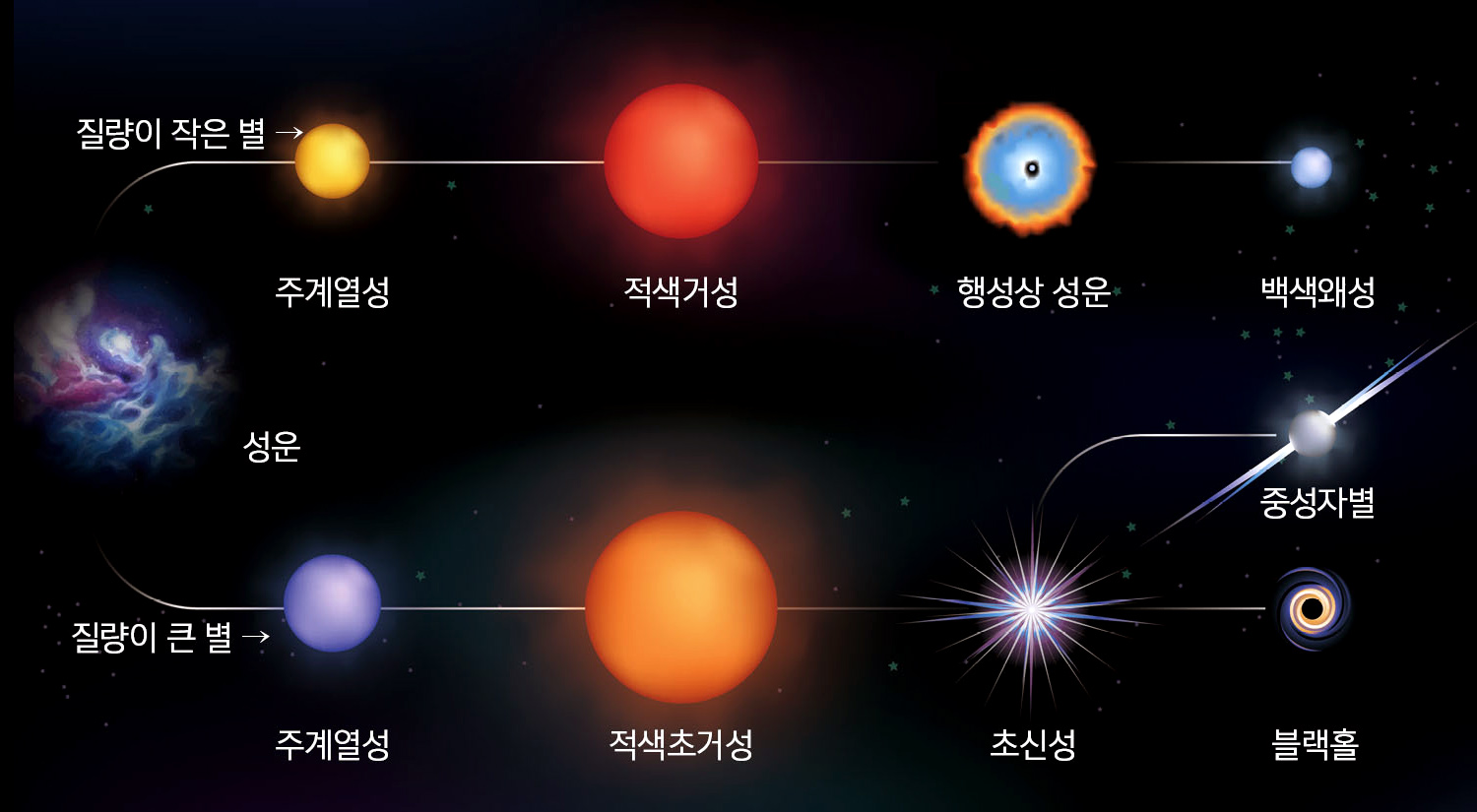 학창시절 비슷한 환경 속에서 자라는 학생들은 청년기를 기점으로 저마다 다른 길을 걷는다. 별들도 주계열성 단계를 지나면 각기 다른 진화과정을 겪고 삶을 마감한다. 별이 핵융합의 재료를 다 써버리면 더 이상 빛을 내지 못하고 중력과 가스압의 균형이 깨어진다. 말년을 준비할 때가 온 것이다.