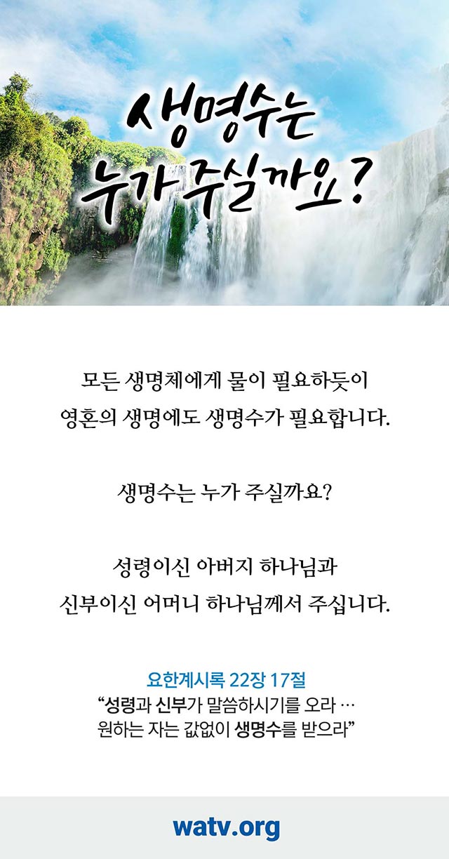 카드 뉴스 생명수는 누가 주실까요? 조회 5,445 카카오톡 공유하기 이미지를 길게 눌러 저장합니다. 마우스 오른쪽 버튼을 클릭하여 이미지를 저장합니다. 카카오톡 공유하기 뒤로가기 관련 글 만나와 안식일 옛적 이스라엘 백성들이 애굽에서 해방되어 약속의 땅 가나안으로 향할 때, 드넓은 광야를 통과해야 했습니다. 그… 무에서 유를 창조하신 하나님 천지 창조의 역사를 보면 무(無)의 세계였던 지구가 하나님의 손길로 하나하나 채워지기 시작했습니다. 낮과 밤이 구분되고,… 예물이 쓰기에 남음이 있었더라 하나님께 두 번째 십계명을 받아 시내산에서 내려온 모세가 이스라엘 백성들 앞에서 십계명을 보관할 성막을 짓는…