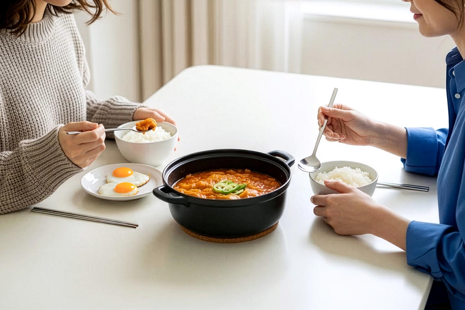 소금에 절인 양배추에 고춧가루를 버무리고 양파와 쪽파를 넣었더니 제법 모양이 배추김치와 비슷해졌다. 오랜만에 김치찌개가 먹고 싶다는 자매님을 위해 양배추김치에 고기를 넣고 김치찌개를 끓였다. 자매님은 진짜 김치찌개 맛이 난다면서 밥 두 공기를 뚝딱 해치웠다.