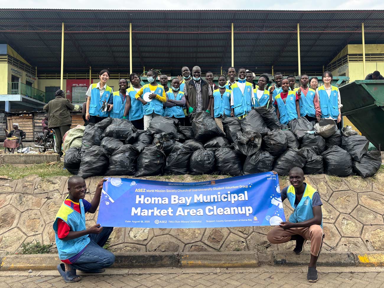 8월 18일, 아세즈(ASEZ, 하나님의교회 대학생봉사단) 케냐 톰음보야대학교 회원들이 호마베이 공설시장 일대에서 거리정화활동을 펼쳤다. 이날 봉사에는 국제 교류 및 봉사활동을 위해 케냐에 간 한국 회원들도 함께했다. 호마베이 카운티 정부의 지원 속에 20여 명의 회원들은 거리에 버려진 페트병, 비닐봉지, 노끈 등 쓰레기 400kg을 주웠다.