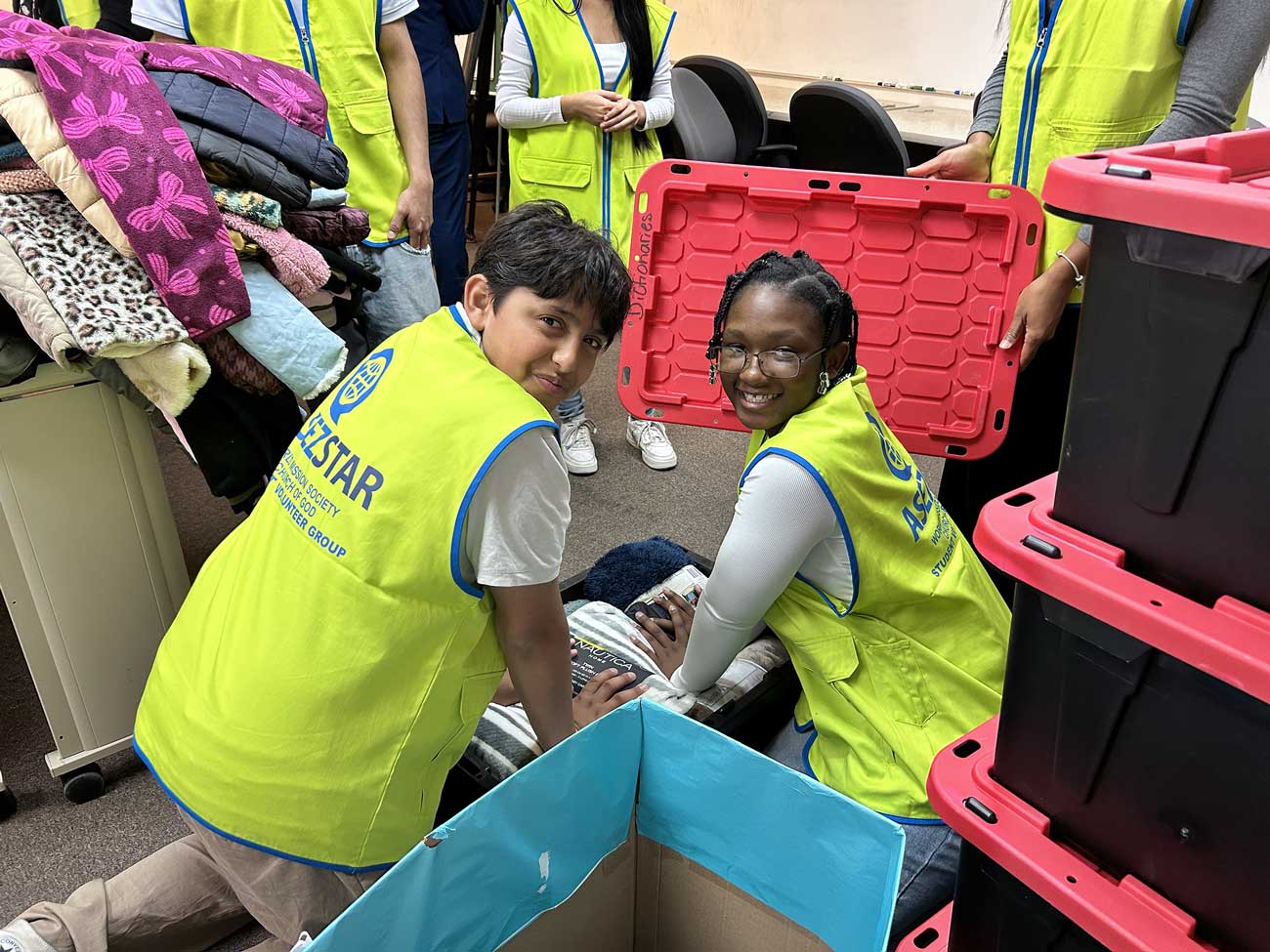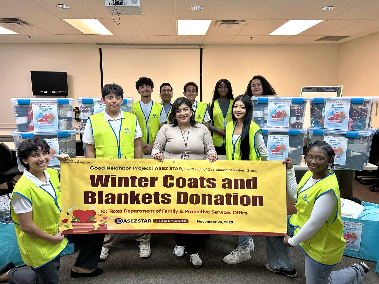 11월 24일, 아세즈 스타(ASEZ STAR, 하나님의교회 학생봉사단) 미국 TX 엘패소지부 회원들이 텍사스 아동 및 가족 보호국에 겨울 코트 60벌과 담요 166채를 기탁했다. 이 활동은 ‘Good Neighbor(이웃사랑 실천)’ 프로젝트의 일환으로, 아세즈 스타 회원들이 직접 기부하거나 학교와 이웃 등에서 기부 받은 물품, 지역 성도, 시민이 기부한 물품으로 진행됐다. 회원들은 코트와 담요를 직접 포장하고 관공서에 전달하며 이웃에게 사랑과 온기를 전했다.