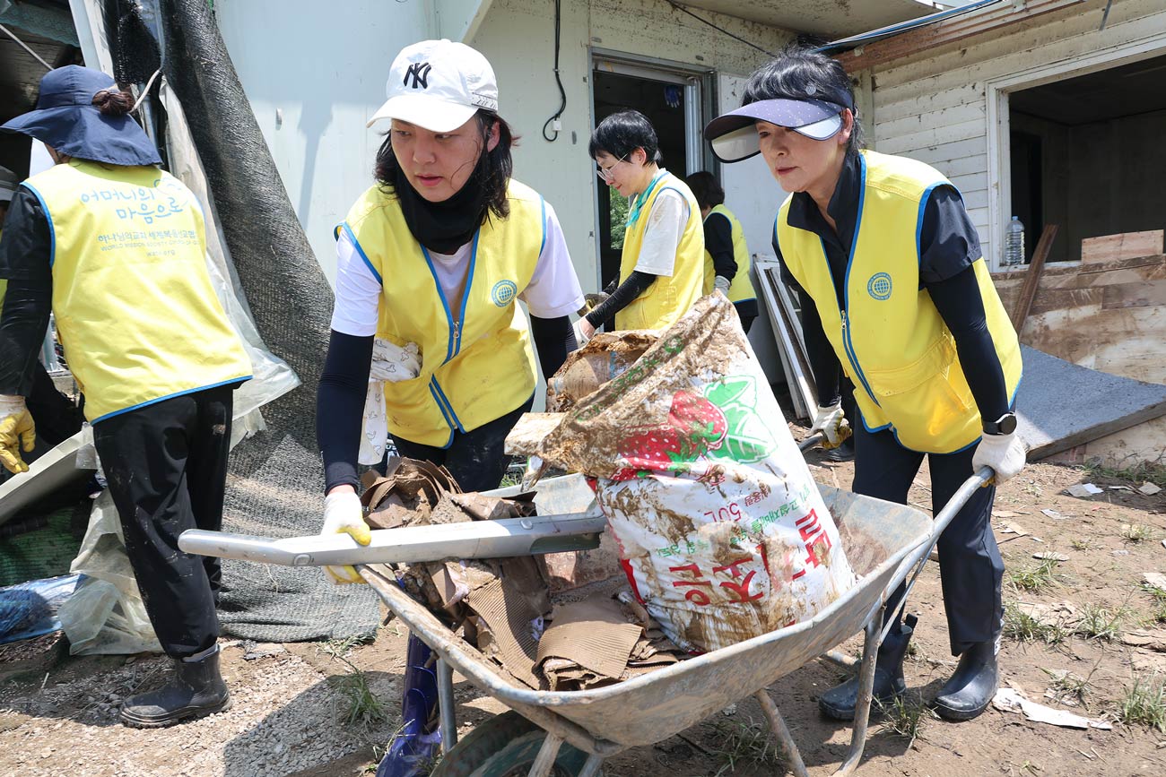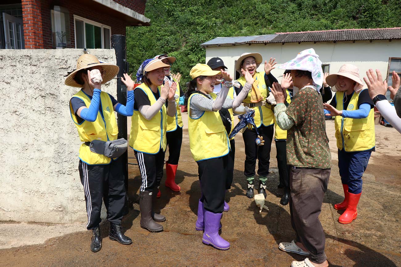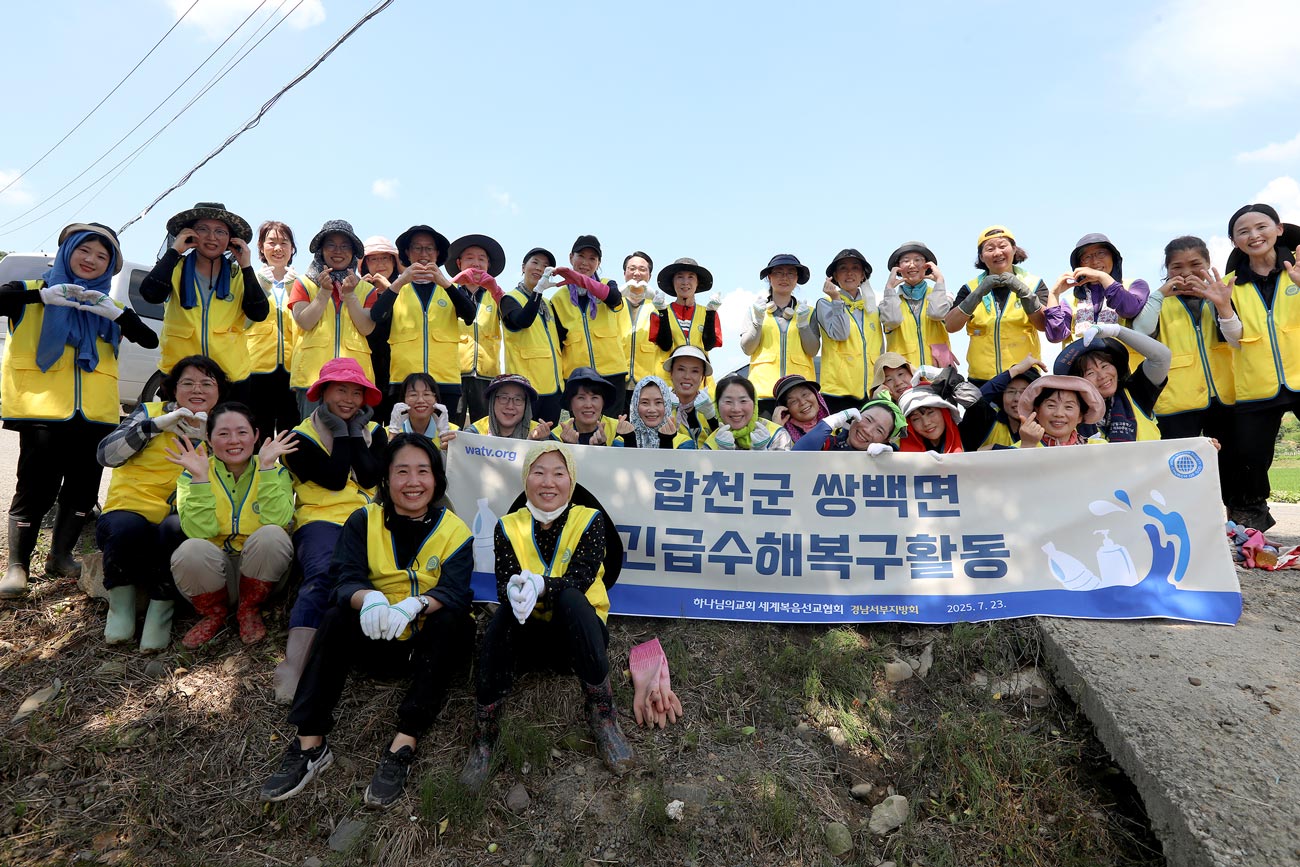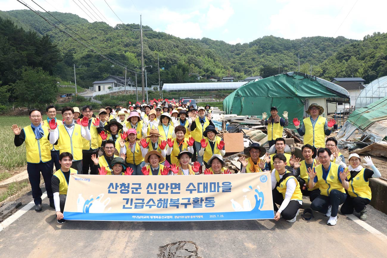 진주·창원·통영·거제 등 경남권 10여 개 지역 성도들이 산청·합천군 총 541세대를 찾아 긴급 수해복구활동을 펼쳤다. 7월 21일과 23일, 양일간 연인원 약 1400명이 두 팔을 걷어붙였다. 성도들은 수해 가정의 가구 및 파손된 물건을 밖으로 옮기고 침수로 더러워진 건물 내부를 깨끗이 닦았다. 비닐하우스와 축사에서는 빗물에 흘러들어 온 진흙과 오물을 퍼내고, 젖은 비료 포대와 상자 등을 정리했다. 한 이재민은 “여러분이 가장 먼저 와서 도와주었다. 정말 고맙다”며 감사 인사를 전했다.