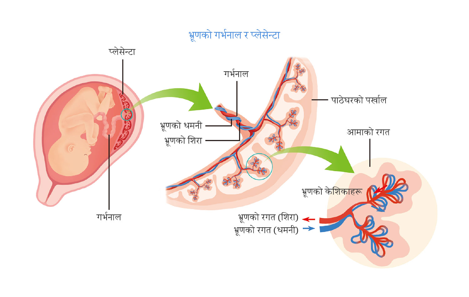 भ्रूणको नाभिबाट सुरु हुने गर्भनाल प्लेसेन्टासँग जोडिएको हुन्छ । यसले आमा र बच्चालाई सिधै जोड्नुका साथै उनीहरूबीच सामग्री आदानप्रदान गर्ने माध्यमको रूपमा काम गर्छ । प्लेसेन्टाको माध्यमद्वारा भ्रूणले अक्सिजन र पोषक तत्त्वहरू प्राप्त गर्छ, र भ्रूणबाट निस्कने कार्बोन्डाइअक्साइडजस्तो अनावश्यक पदार्थलाई आमाकहाँ पुऱ्याउँछ । तर रोचक कुराचाहिँ एन्टिबडिज हो । जन्मेको पहिलो छ महिनामा, बच्चाहरूलाई दादुरा वा बिफर जस्ता संक्रामक रोगहरू सजिलै लाग्दैनन्, किनभने तिनीहरू आमाबाट एन्टिबडिज लिएर जन्मेका हुन्छन् । तर सबै मातृ एन्टिबडिजहरू प्लेसेन्टाबाट जान नसक्ने भएकोले, तिनीहरूमा लहरे खोकी वा चिकेनपक्स जस्ता रोगहरूसँग लड्ने प्रतिरक्षा प्रणाली हुँदैन ।