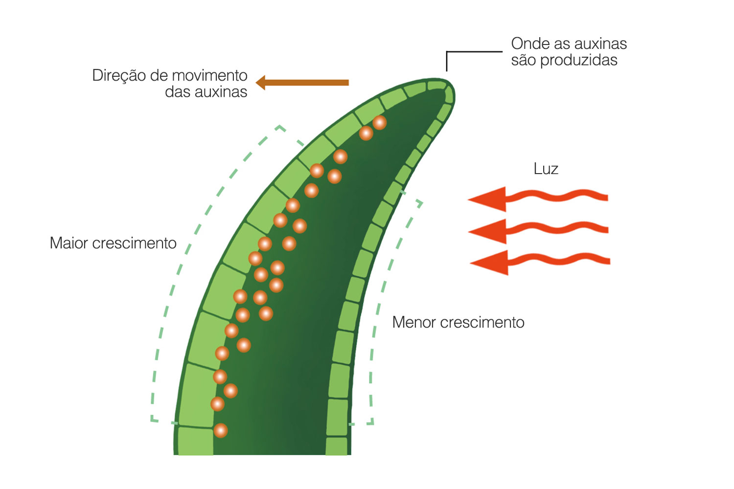 O fototropismo ocorre devido à ação de um hormônio vegetal chamado auxina, que regula o crescimento da planta. A auxina tende a se deslocar para o lado oposto à luz e para a direção da gravidade. Quando sua concentração aumenta em uma região, ela estimula o crescimento do caule e das folhas. Assim, no caule e nas folhas, a auxina se acumula no lado sombreado, fazendo essa parte crescer mais; com isso, o lado iluminado se curva, direcionando a planta para a luz. Além disso, como a auxina se acumula na direção da gravidade, o caule e as folhas crescem voltados para cima.