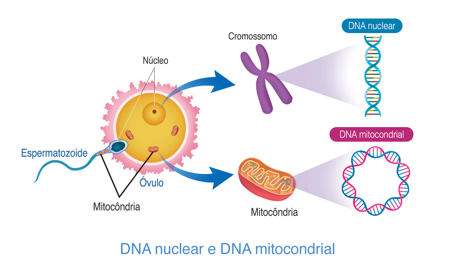Vemos que as mitocôndrias, essenciais para a nossa vida, têm uma característica curiosa: todas as mitocôndrias em nossas células são herdadas de nossas mães; isso é chamado de herança materna. Esse fato contrasta com a herança paterna, que “consiste em receber o cromossomo Y do pai”.