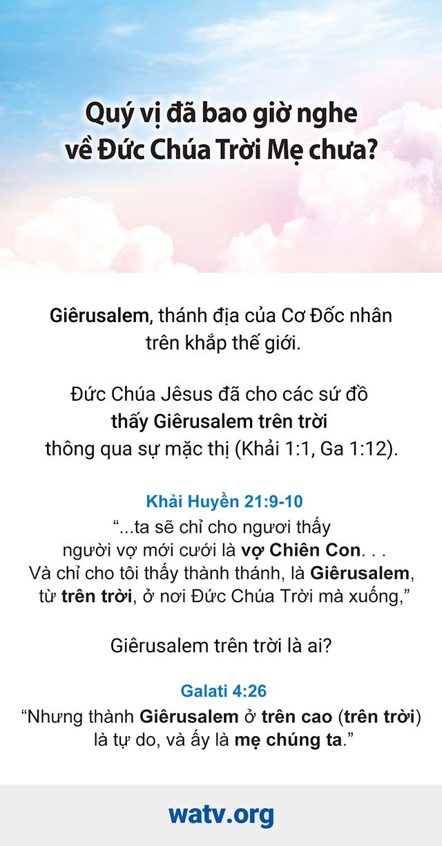 Tin tức trong bưu thiếp Quý vị đã bao giờ nghe về Đức Chúa Trời Mẹ chưa? 11,773 lượt xem 카카오톡 공유하기 Nhấn vào hình ảnh đủ lâu để lưu nó. Nhấp chuột phải để lưu hình ảnh. 카카오톡 공유하기 Trở lại Bài viết liên quan Cấu tạo và đặc tính của Kinh Thánh 1. Ngôn ngữ của Kinh Thánh Từ “Kinh Thánh (Bible)” có xuất xứ từ tiếng… Matador Con bò vàng hưng phấn bởi bàn tay điệu nghệ của đấu sĩ bò tót… Không phải những gì chúng ta thấy được là tất cả Như biệt danh “Loài thông minh nhất”, nhân loại đã phát triển văn minh đến…