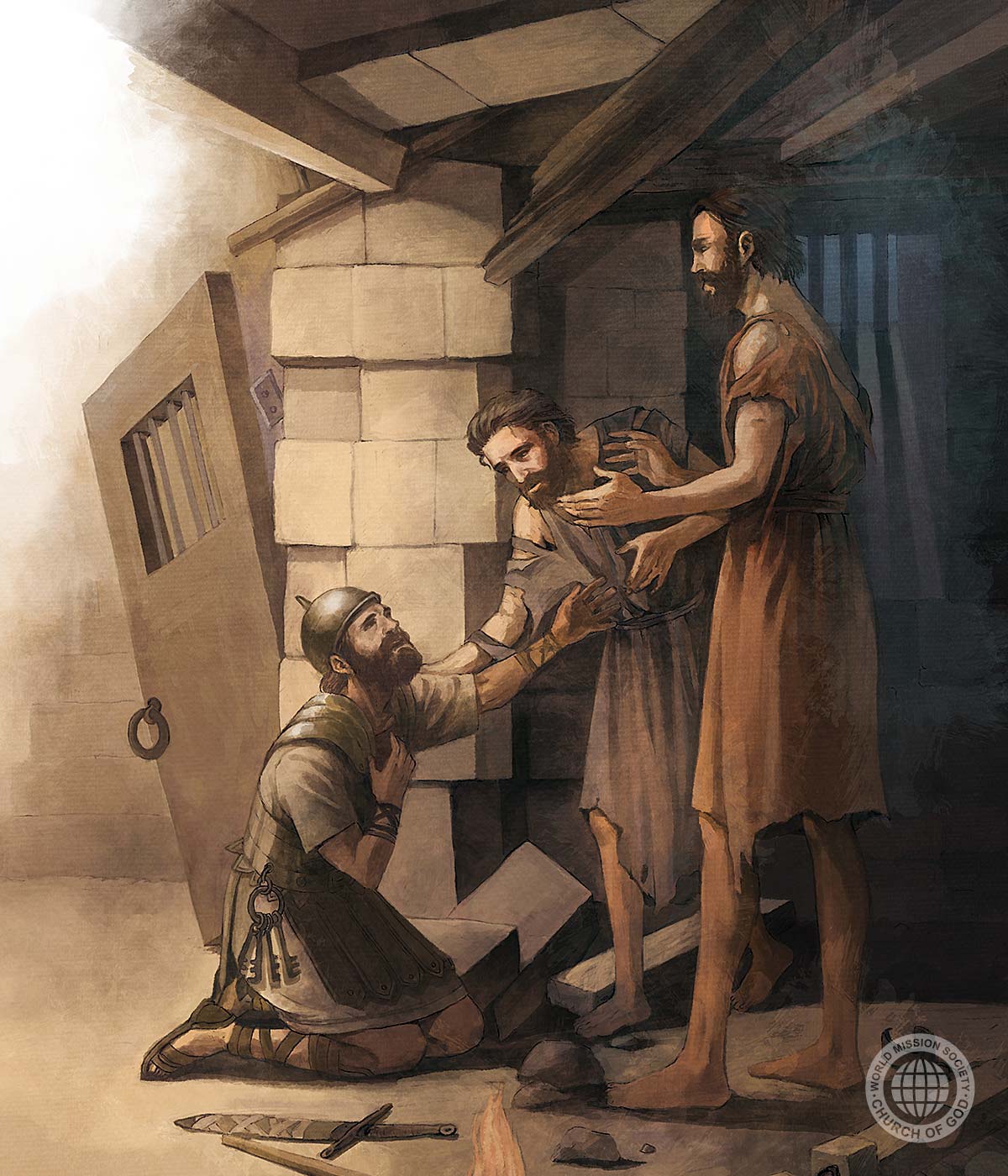 Phaolô và Sila bị giam vào ngục tối và tra chân vào cùm (dụng cụ bằng gỗ dùng để cố định tù nhân), song họ vẫn cầu nguyện và hát ngợi khen Đức Chúa Trời ngay cả giữa đêm khuya. Thình lình có cơn động đất rất lớn, đến nỗi nền ngục rúng động, cùng một lúc, các cửa mở ra, xiềng tù phạm đều tháo cả.