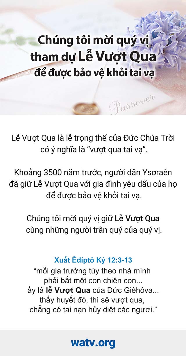 Tin tức trong bưu thiếp Chúng tôi mời quý vị tham dự Lễ Vượt Qua để được bảo vệ khỏi tai vạ 14,801 lượt xem 카카오톡 공유하기 Nhấn vào hình ảnh đủ lâu để lưu nó. Nhấp chuột phải để lưu hình ảnh. 카카오톡 공유하기 Trở lại Bài viết liên quan “Jêsus, Vua Dân Giuđa” được ghi trên bảng đề chữ chỉ về án Nếu là thánh đồ ở trong lẽ thật, thì ai cũng biết rõ rằng lý… Hai quyền công dân của Phaolô Quyền công dân là quyền lợi của công dân với tư cách là nhân dân… Du hành hai vòng rưỡi trái đất “Vòng quanh thế giới trong 80 ngày” là tiểu thuyết của Jules Verne được xuất…