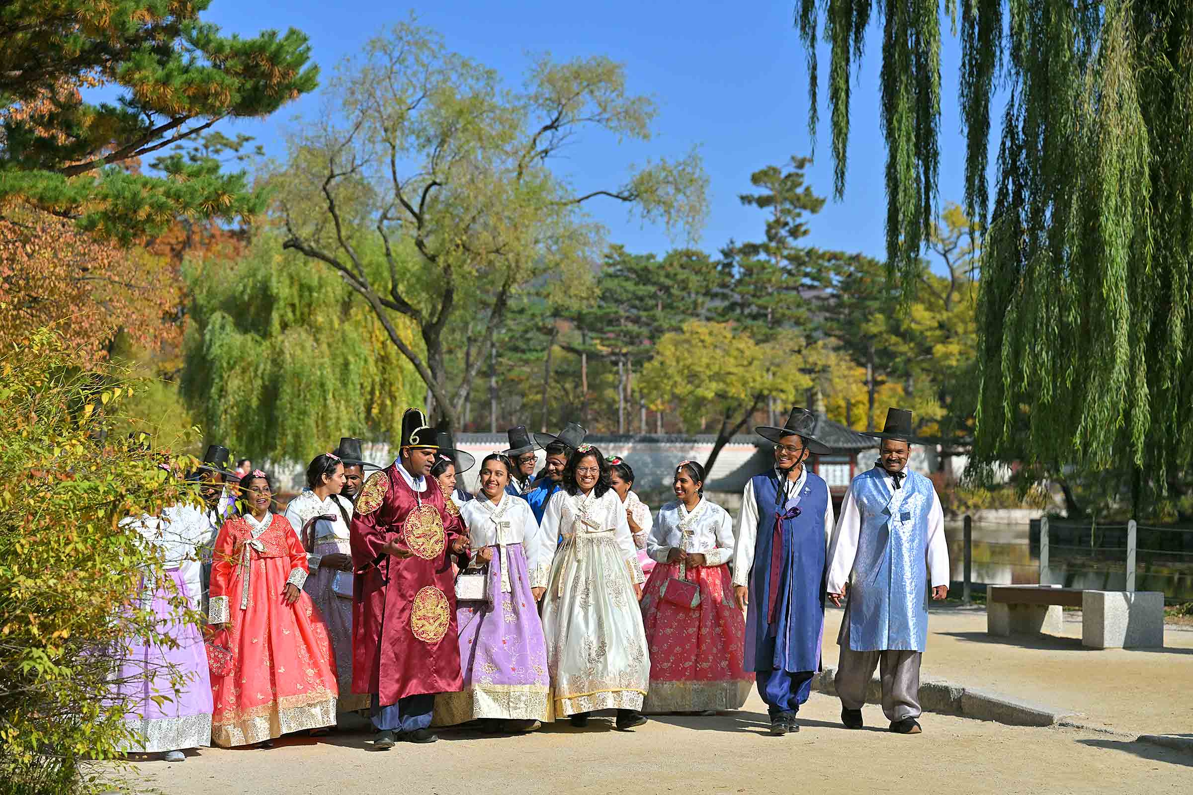 访问团的行程安排紧凑而充实,包括走访承载着父亲母亲足迹的首尔及仁川地区教会、参加献堂纪念礼拜,以及参观景福宫国立中央博物馆首尔天空观景台水族馆等。在各地教会,手持万国旗的韩国圣徒们热情欢迎访问团,而访问团圣徒们身着的五彩缤纷的传统服饰,更为层林尽染的秋色增添了一抹亮丽的色彩。大家还参观了上帝的教会历史馆,以及“读懂父爱真情”展、“母亲”书画摄影展和“MEDIA’S VIEWS”展览。从教会初创时期天上父亲母亲亲手开垦福音田地所付出的牺牲,到天国家族温暖的爱……圣徒们在丰富多样的行程中,积累了值得长久铭记的感悟与回忆。通过生动地见证韩国福音爆发式成长的历史,大家获得了在各自岗位上迅速成就福音事工的信心。