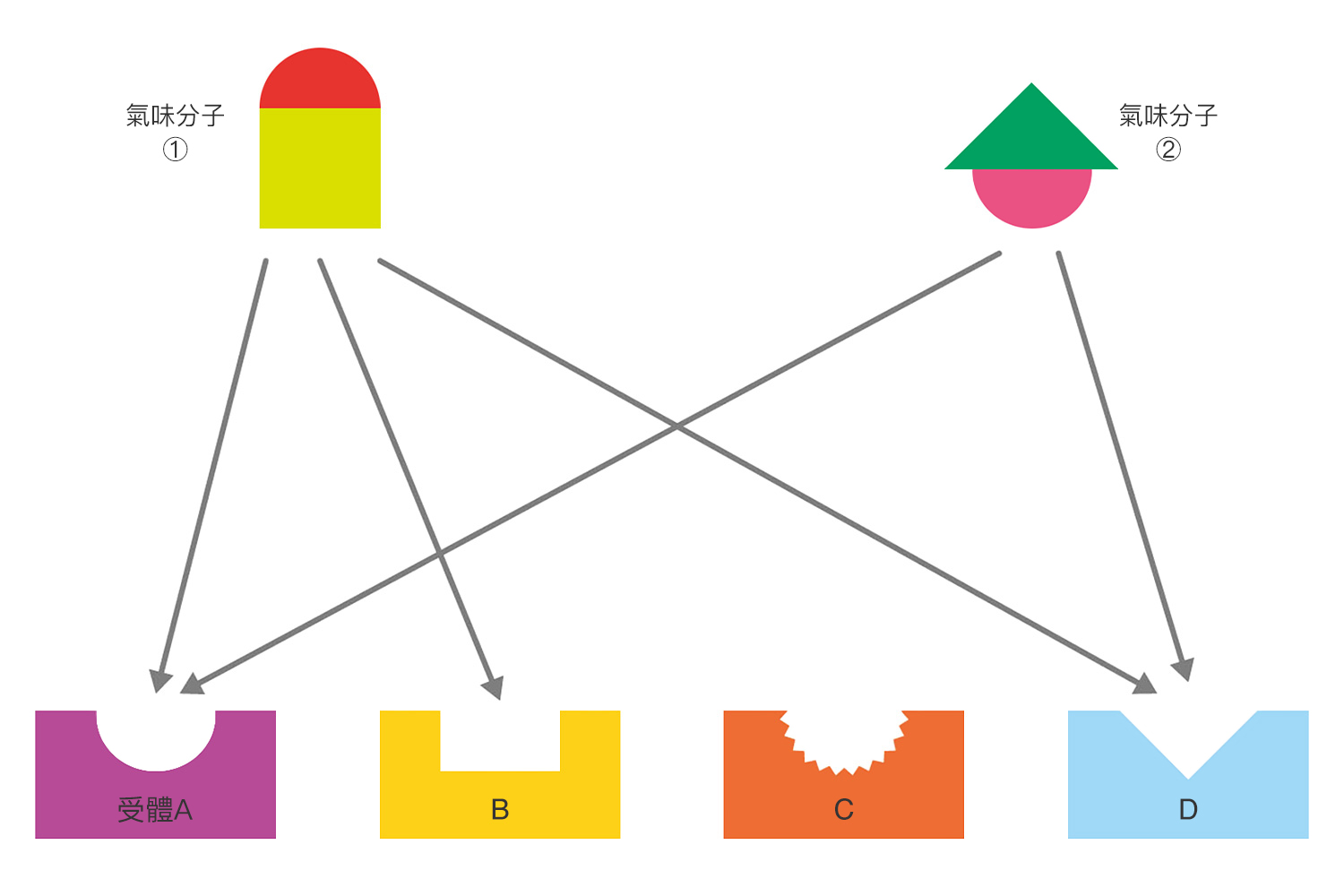 然而,一個受體並非專門針對一種氣味。多種受體會同時對一種化學物質作出反應,從而區分不同的氣味。與分子不同部分結合的不同受體,會向大腦發送不同的訊號片段。也就是說,透過嗅覺受體與氣味物質結合的不同組合,我們能夠感知到無數種不同的氣味。因此,生物能夠嗅到的氣味種類遠遠超過嗅覺受體的種類。